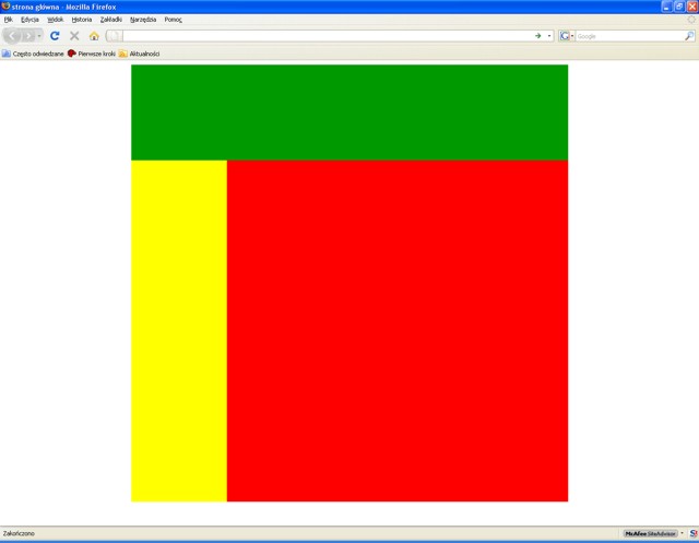 <!DOCTYPE html> <html lang="pl"> <head> <meta charset="utf-8"> <title>strona główna</title> <meta name="keywords" content="słowa kluczowe"> <meta name="description" content="opis zawartości strony"> <meta name="author" content="imię i nazwisko autora, adres email"> <!--<link rel="stylesheet" type="text/css" href="styl.css">--> </head> <body> <div style="text-align:center; width:800px; margin-left:auto; margin-right:auto;"> <table border="0" cellspacing="0" cellpadding="0"> <tr style="background-color:#009900"> <td height="175" colspan="2"> </td> </tr> <tr> <td width="175" height="625" style="background-color:#ffff00"> </td> <td width="625" height="625" style="background-color:#ff0000"> </td> </tr> </table> </div> </body> </html>